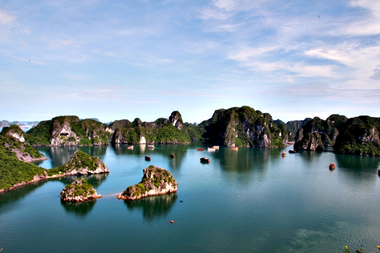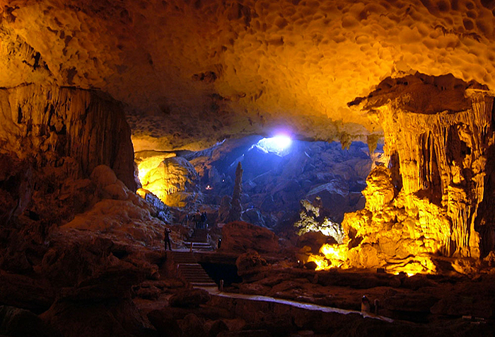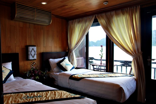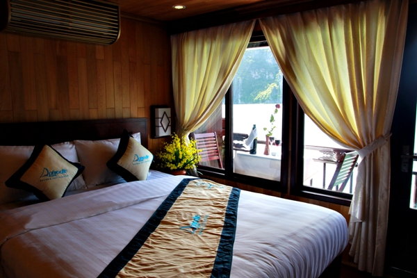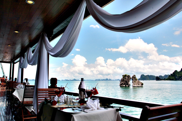 Aphrodite Cruiser will bring you to visit many famous destinations such as Thiencung (Heavenly) Grotto, Ga Choi (fighting cocks) islet, Me cung (Bewitching) grotto , Sung sot (Surprise) grotto, Dau Go (Wooden Stakes) Grotto, Trinh Nu (Virgin) grotto, Luon Cave, Titop island, Cua Van floating fishing village, ect… and many so amazing activities as cooking class, Tai Chi, Kayaking, swimming, massage, ect. When the mantle of darkness is let down on the sea, tourists together enjoy dinner with sea foods surrounded by miraculously peaceful and quiet atmosphere with reflected moonlights and starlight drifting sluggishly in the bay.