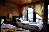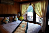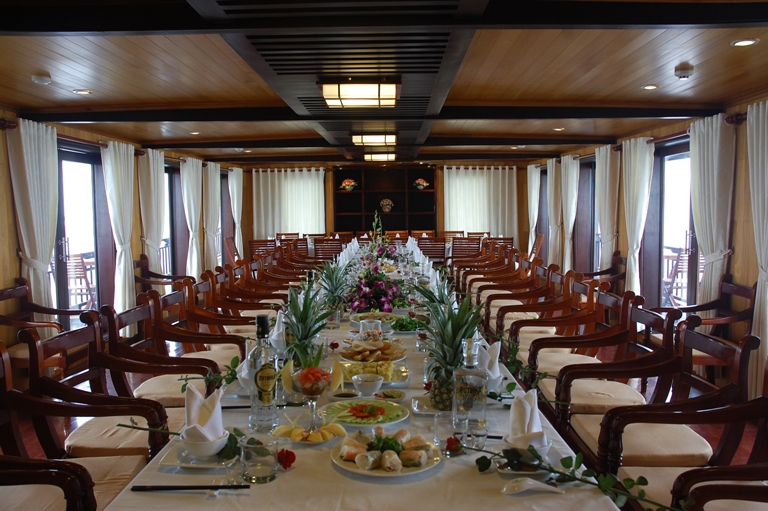 ● Program and Cruise Itinerary ● In-house English speaking Tour guide ● Luxury cabins with A/C ● Luxury en-suite bathroom ● Jacuzzi bath (for VIP room) ● Hairdryer, bathrobes slippers ● In-house telephone ● Mini-bar for all cabins ● 32 inches TV ● DVD, music loudspeaker ● Karaoke ● Restaurant, bar, relaxing and sunbathing area on the sundeck ● Full-board meal ● In-cabin services (snacks) ● Wine, beer & cigar selection ● Complementary kayaking, swimming and snorkeling equipment ● Vietnamese cooking class ● Beauty services and massages ● Tai Chi demonstration ● Souvenirs shop ● Relax activities: watching TV, playing chess, squid fishing… ● Meeting and conference facilities and equipment (charter only) ● Traveling programs for special themes (charter only) ● Special relaxing activities (charter only) ● Safety Facilities and First-Aid Equipment ● Transportation by high-speed board ● Professional English-speaking local crew and high-quality foreign management