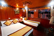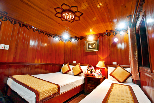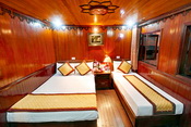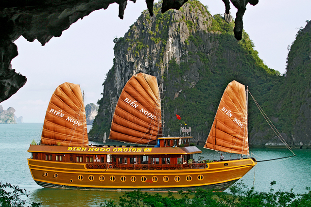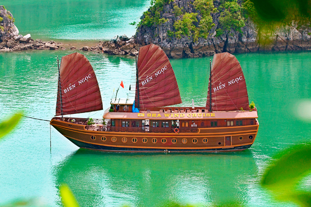 13.00 - 18.00: Lunch is served while cruising through Halong Bay. Roam around the labyrinth of the Bay through the Fighting Cock, Canh Buom, and stop for swimming then go for visiting Sung Sot cave (Surprise Cave). Visit Luon cave to take photos by rowing boat or tender.
