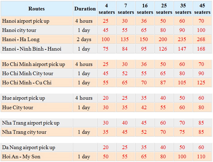 (Price quoted in USD) To rent a car, please contact us via email at info@vietindotravel.com